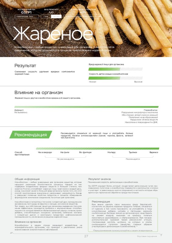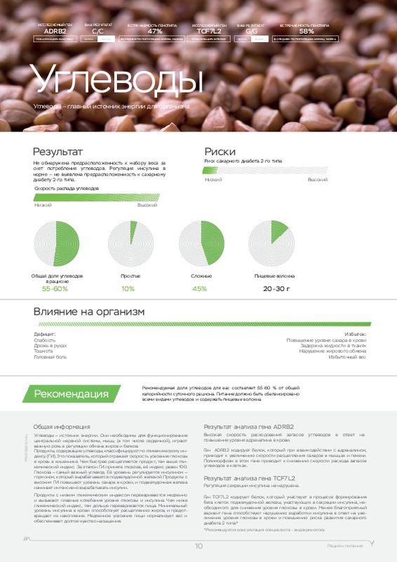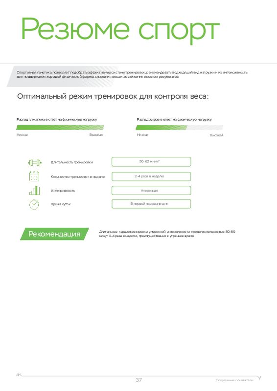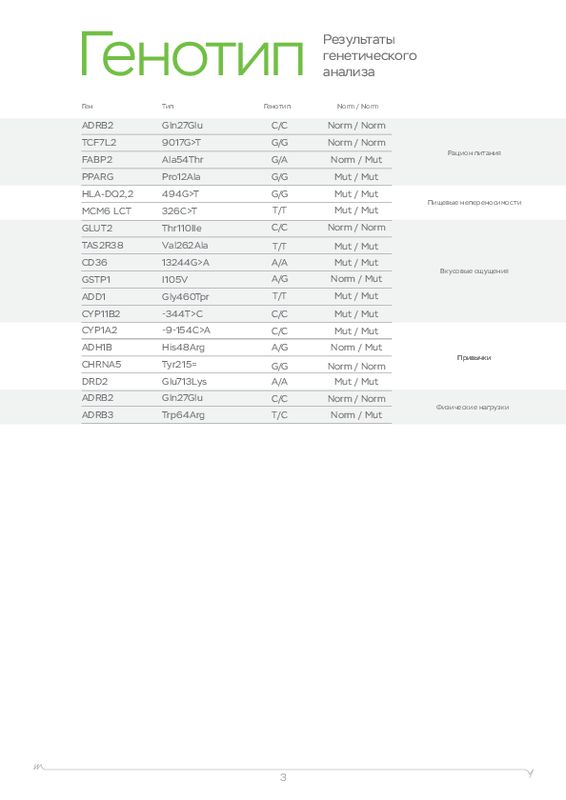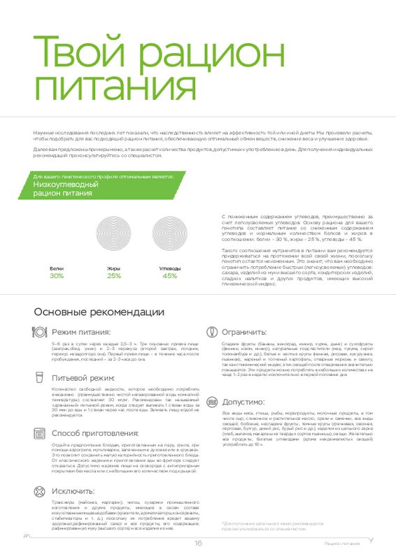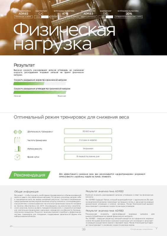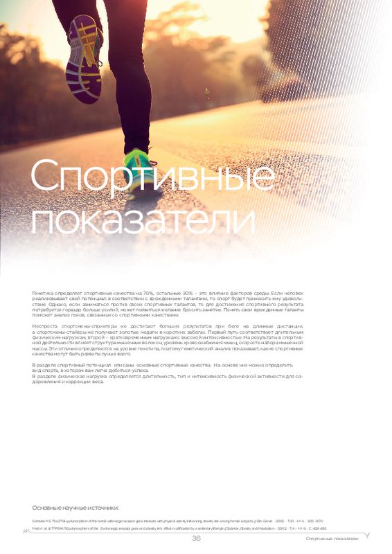 Этот ДНК анализ показывает, к каким физическим нагрузкам человек расположен генетически, а также какие продукты (содержащие определенные элементы) лучше употреблять в пищу. У каждого человека свои цели, кто-то хочет просто сбросить лишний вес, кто-то увеличить силу мышц, а кто-то нарастить огромные мускулы. Для получения максимальной отдачи от тренировок мы рекомендуем пройти наш генетический тест для фитнеса в .