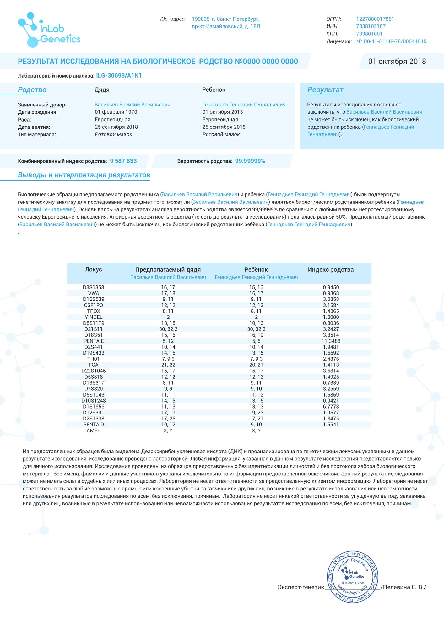 Лаборатория имеет полную аккредитацию и сертификацию. Заключения являются полными и развернутыми. Генетическая экспертиза ДНК становится основным доказательством в судебных спорах и принимаются всеми судами и государственными учреждениями Республики Беларусь.