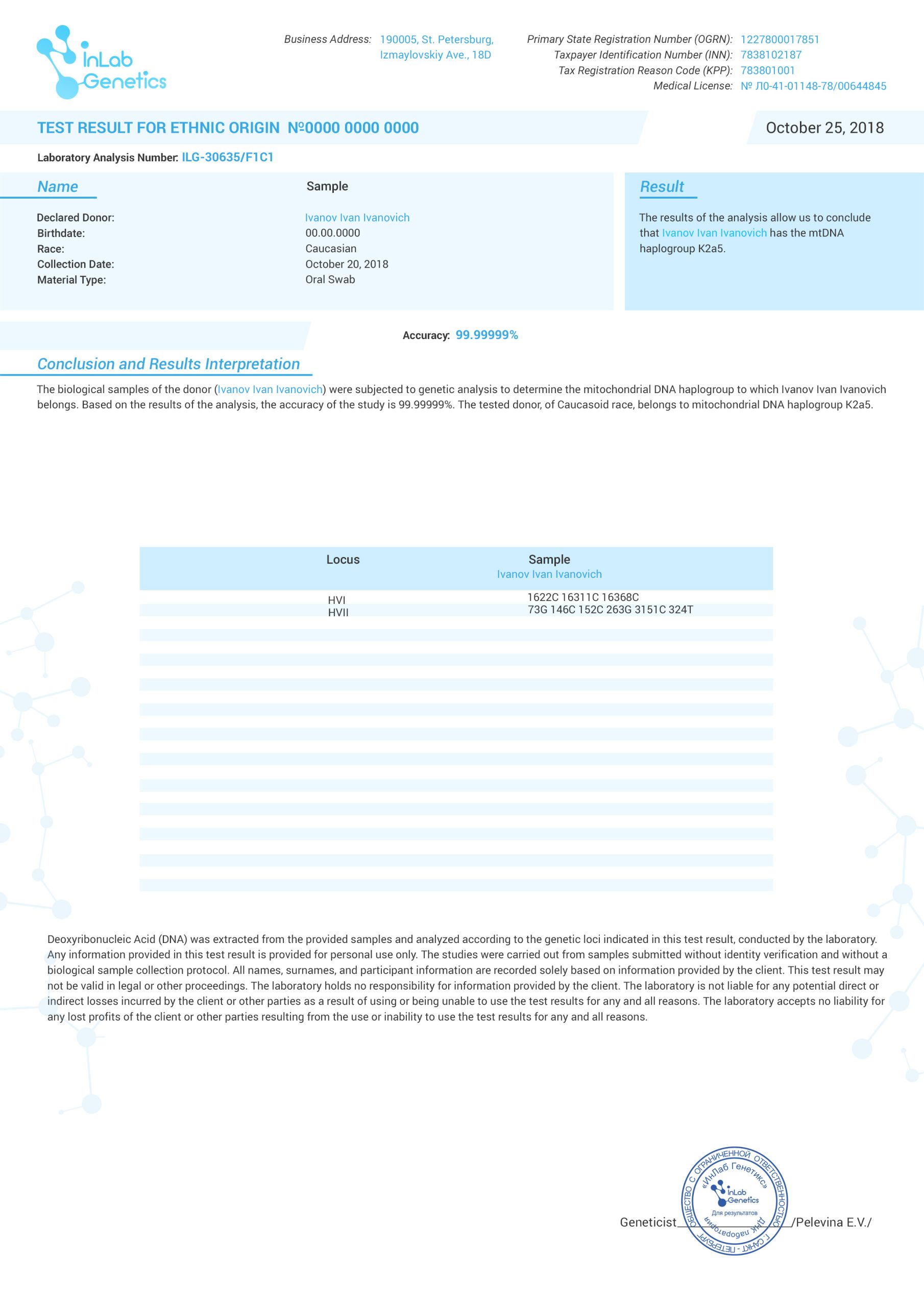 Each order is assigned a unique identification number. The laboratory guarantees 100% security and confidentiality of all data received from you.