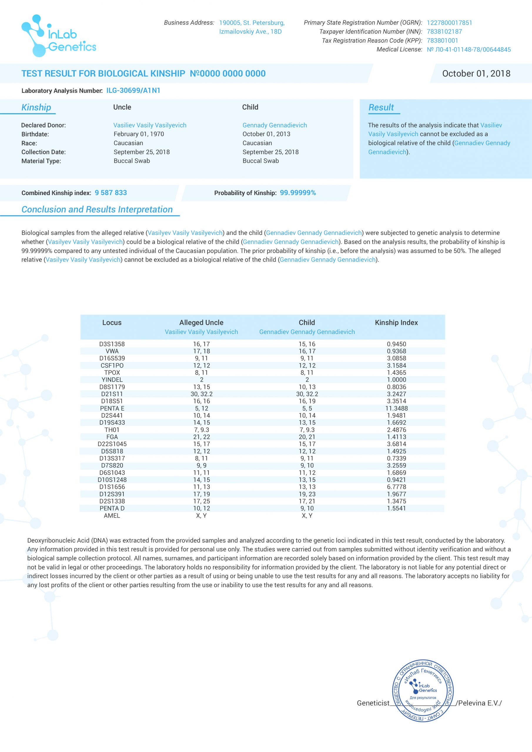 The laboratory has full accreditation and certification. The conclusions are complete and detailed. DNA genetic testing is becoming the main evidence in litigation and is accepted by all Belarusian courts and government agencies.