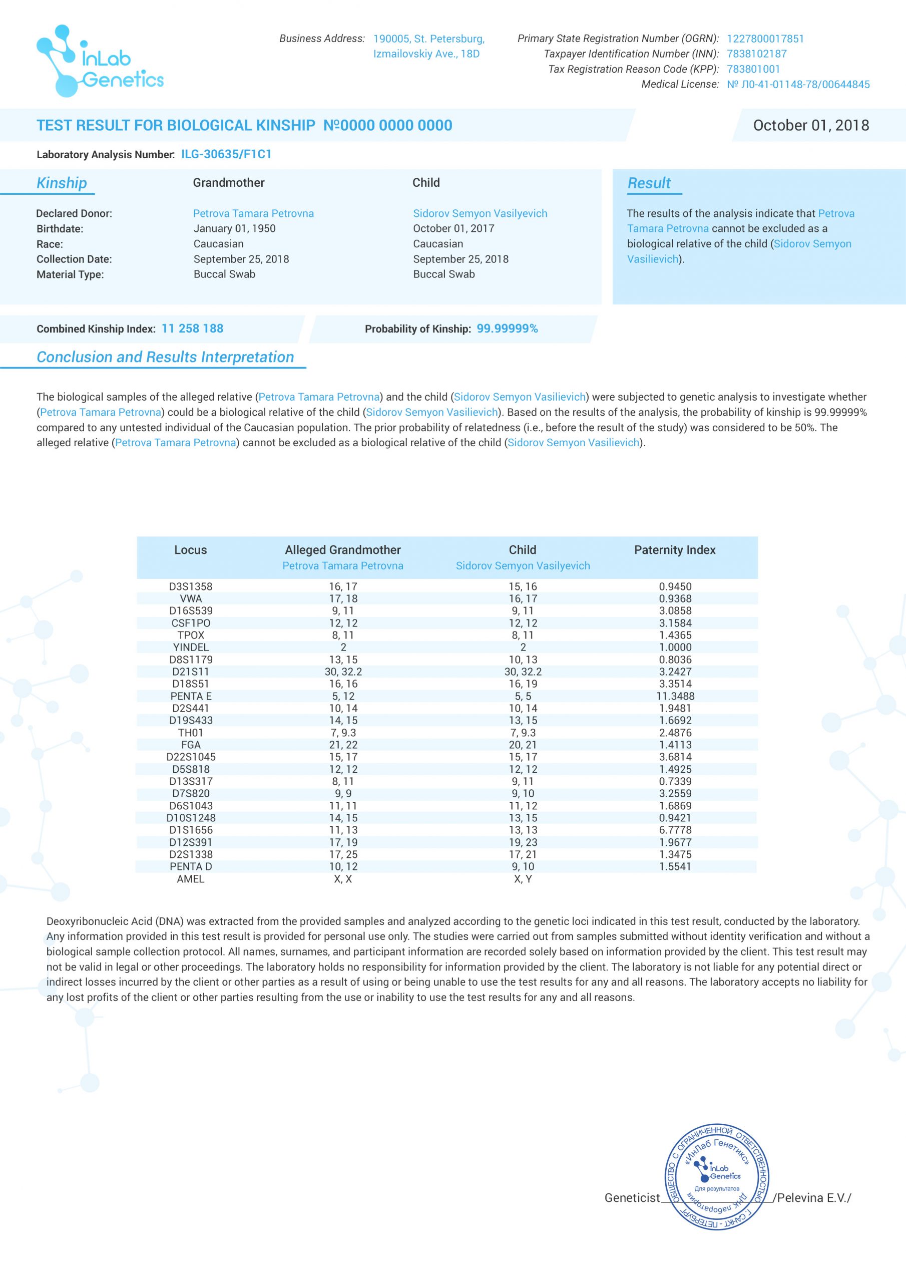 In various cases, it may be required to establish the relationship between grandparents and grandchildren in . The analysis can be conducted anonymously, without verifying the participants’ identities or it can be performed with full identification of all participants, for legal purposes.