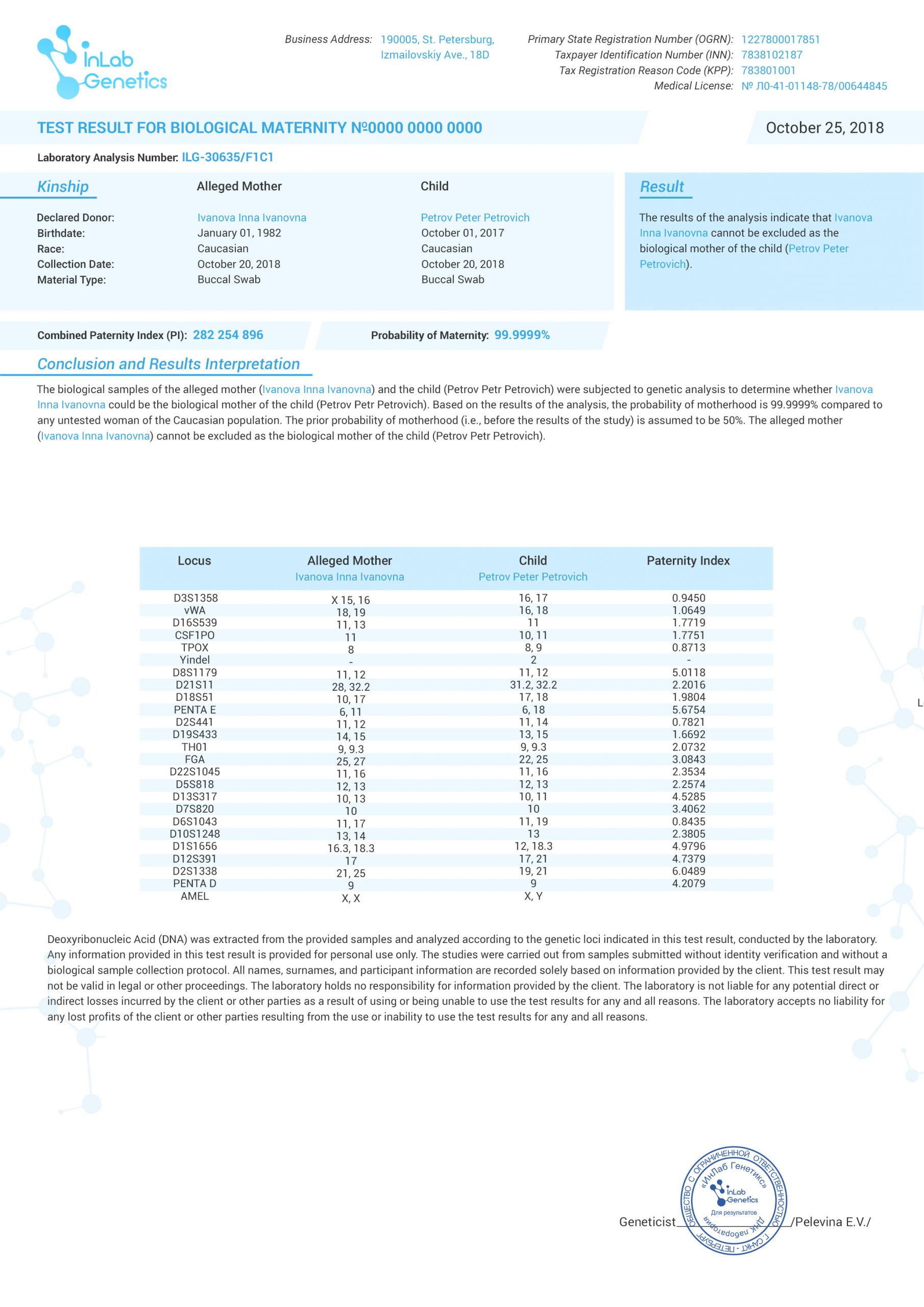 To ensure the highest level of accuracy of the DNA maternity test result, the laboratory conducts two parallel tests by separate teams of experts. The results are then certified by the signature of the Lab Manager and the seal of the laboratory.