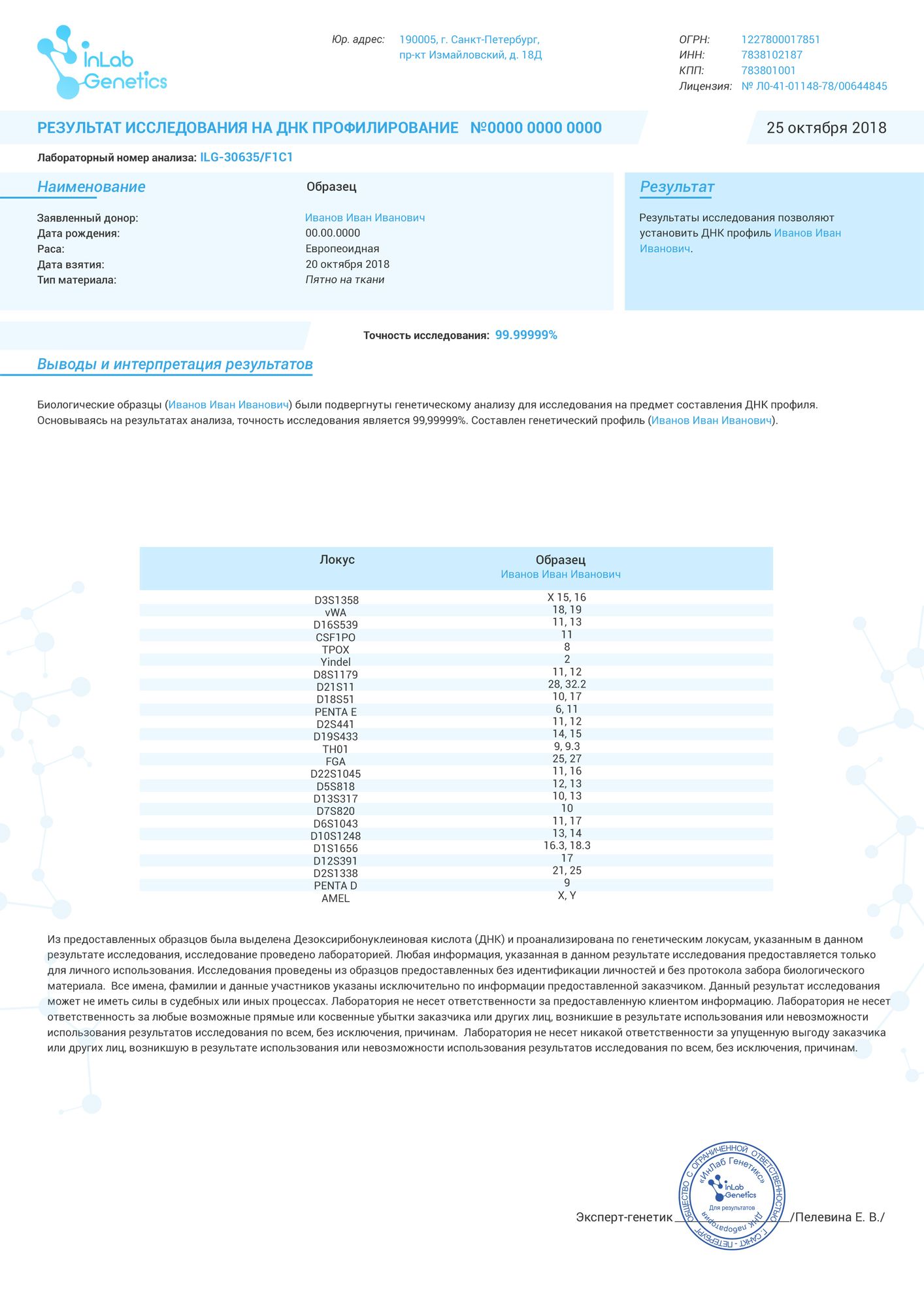 Точность этого ДНК исследования высочайшая и достигает 100%. Для абсолютной точности результата идентификации человека лаборатория проводит параллельно два теста разными группами специалистов. Затем результаты заверяются подписью заведующего и печатью лаборатории.