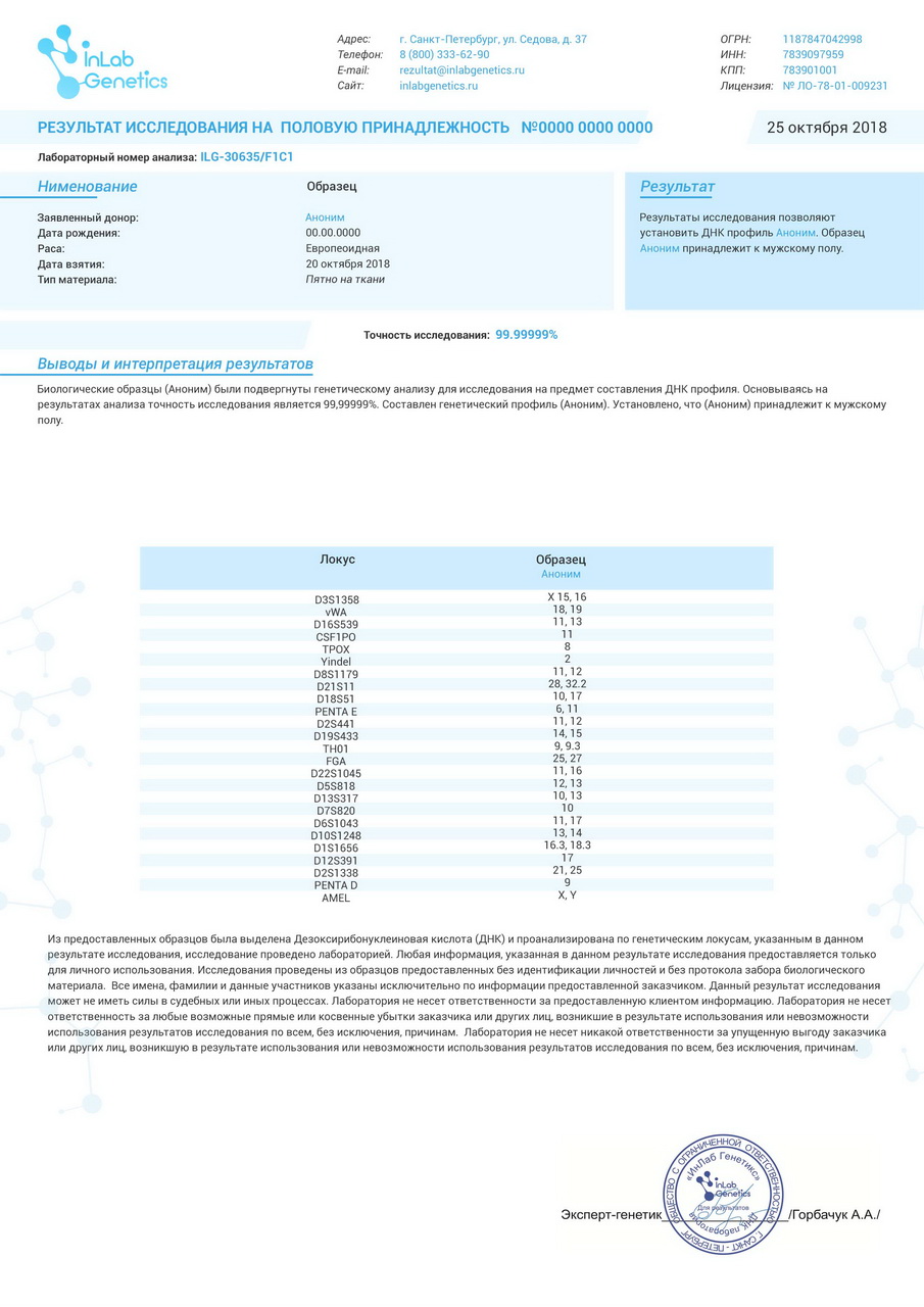 Анализ ДНК на измену в проводится анонимно (без подтверждения личностей участников анализа), по Вашему желанию мы можем внести в протокол имена или фамилии. Но только по вашему волеизъявлению! Наши специалисты подскажут, как лучше поступить в Вашей конкретной ситуации.